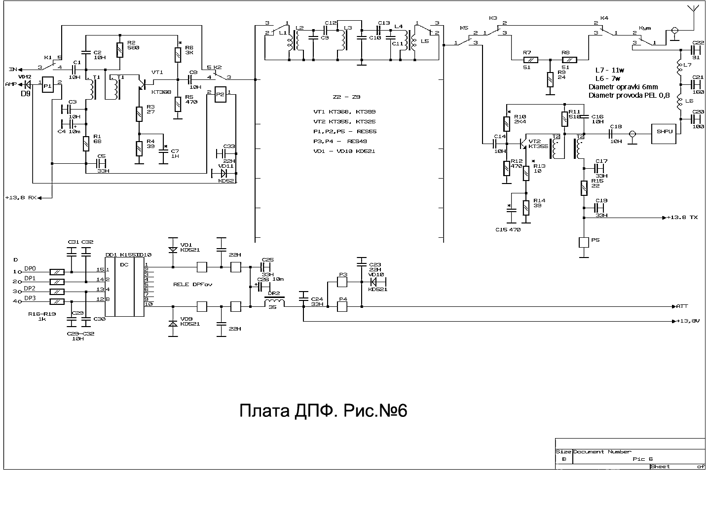 На плате ДПФов расположены широкополосный усилитель высокой частоты (VT1), первый каскад усилителя передатчика (VT2), аттенюатор, девять полосовых фильтров, которые включаются дешифратором DD1 управляемым двоично-десятичным кодом по шине D, поступающим от синтезатора частоты.
